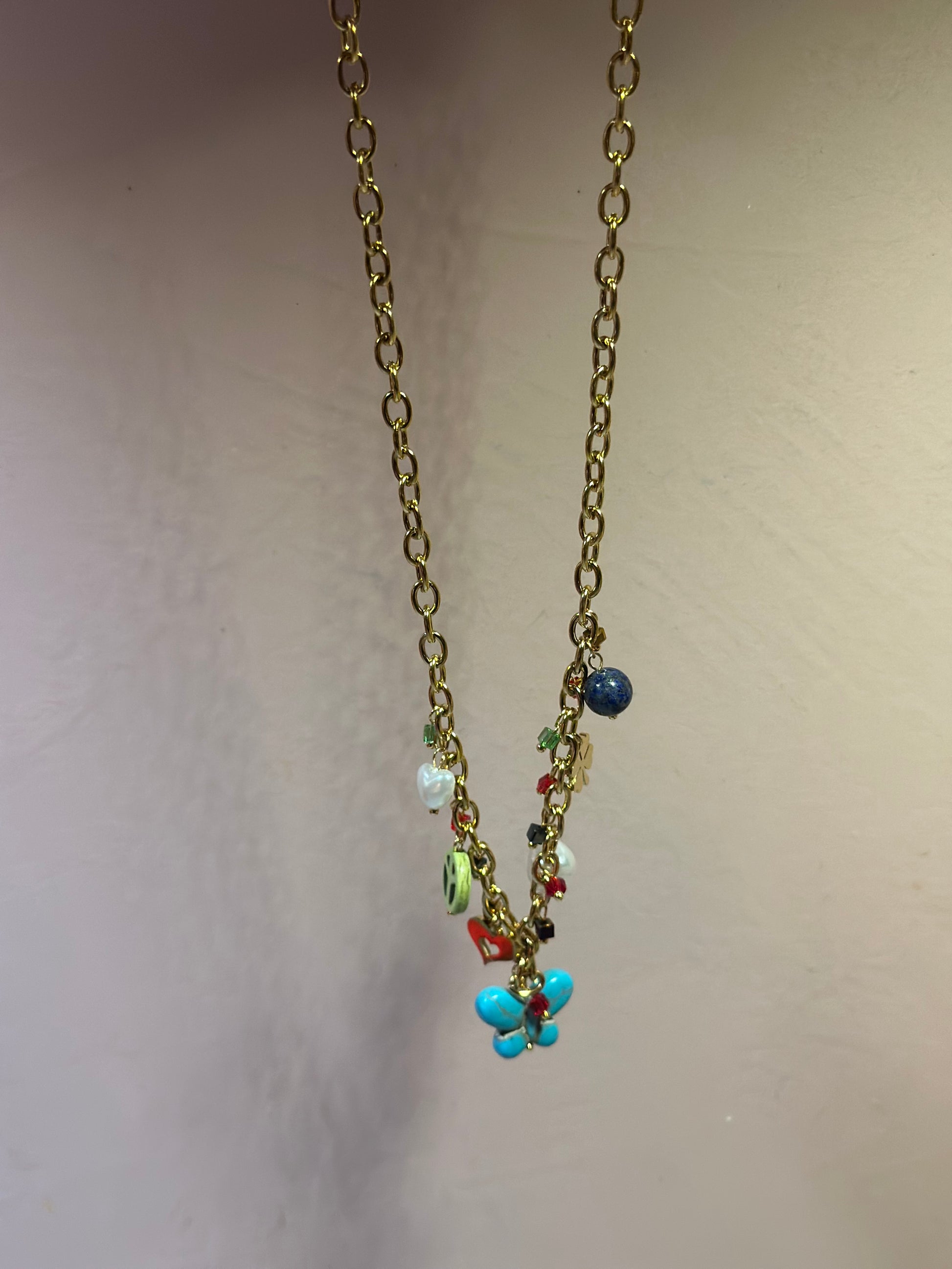 Ihana kaulakoru, täynnä ”onnen-amuletteja”. Materiaali on ruostumatonta terästä, joten ei ruostu.